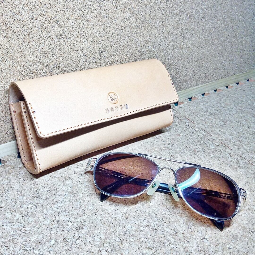 ヌメ革のメガネケースで、マチが広いので大きいメガネやサングラスも入ります。