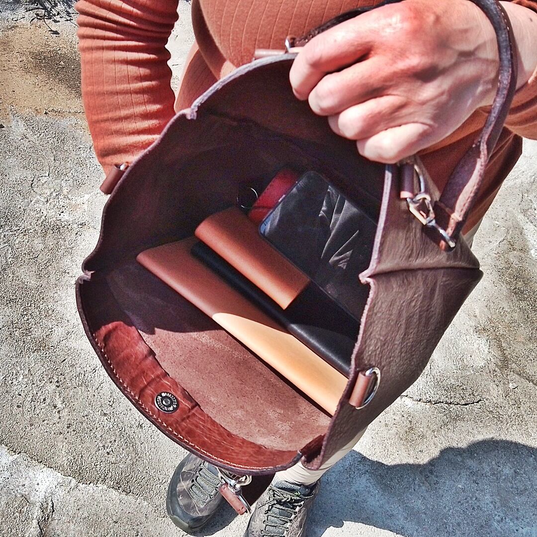 ヌメ革で作ったスマホや財布などが入るトートバッグです♪