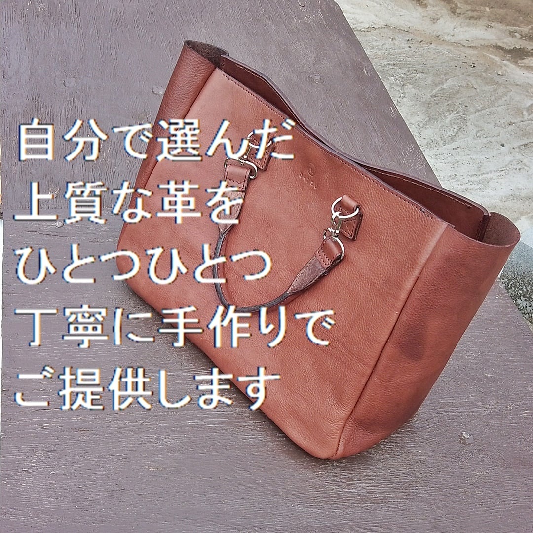 ヌメ革で作ったスマホや財布などが入るトートバッグです。
